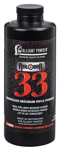 Alliant's Reloder 33 uses the same kernel-impregnation technology first pioneered in Reloder 17. It employs a proprietary process by which the powder kernels are impregnated with burn-rate controlling elements. This delays the peak pressure spike and smooths out the pressure curve. This allows the powder to deliver energy at a more constant rate, producing more overall velocity for the bullet as much as 150 fps more than with any other powder.