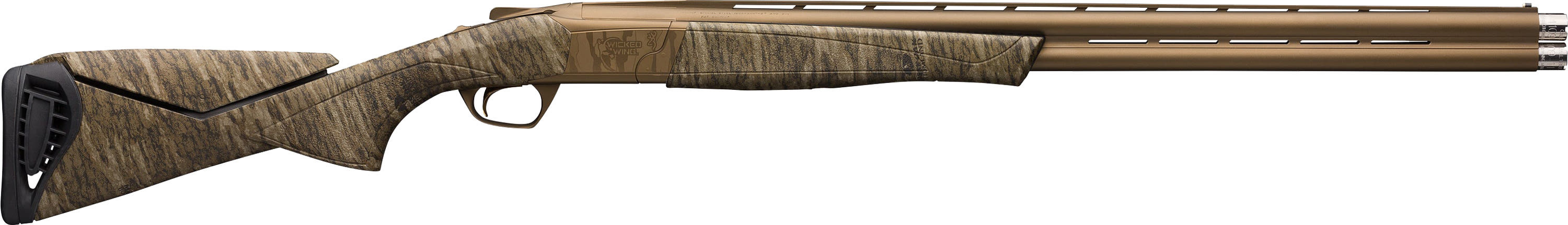 An over and under for rugged environments. From the day the Cynergy was introduced, it was different. The ultra low-profile receiver and MonoLock Hinge design made it smaller, lighter and more nimble than other over and under shotguns — and the styling reflected the innovative qualities of the shotgun. Jump forward to today and we give you the Cynergy Wicked Wing, an over and under shotgun built to withstand virtually whatever comes its way with a Cerakote Burnt Bronze finish combined with Mossy Oak Bottomland camo, adjustable comb, fully chromed bore and more.