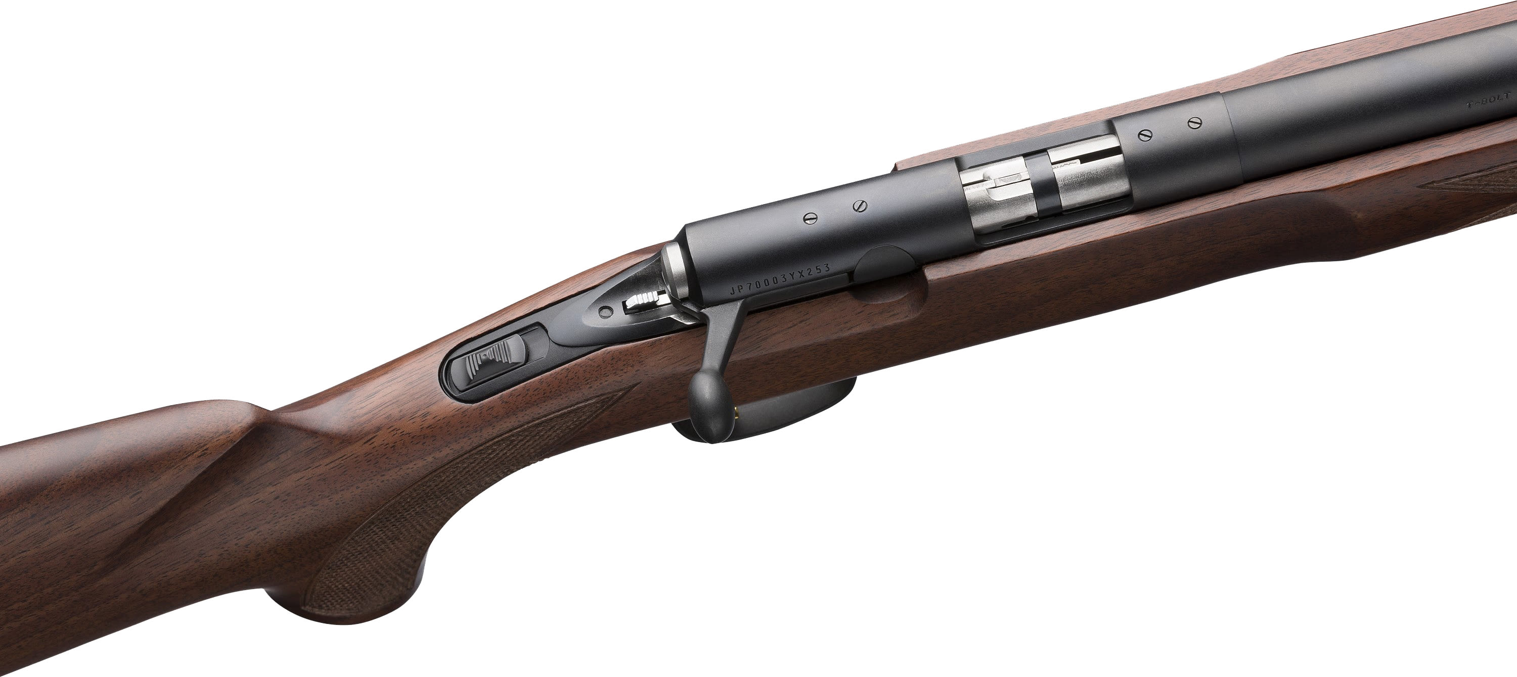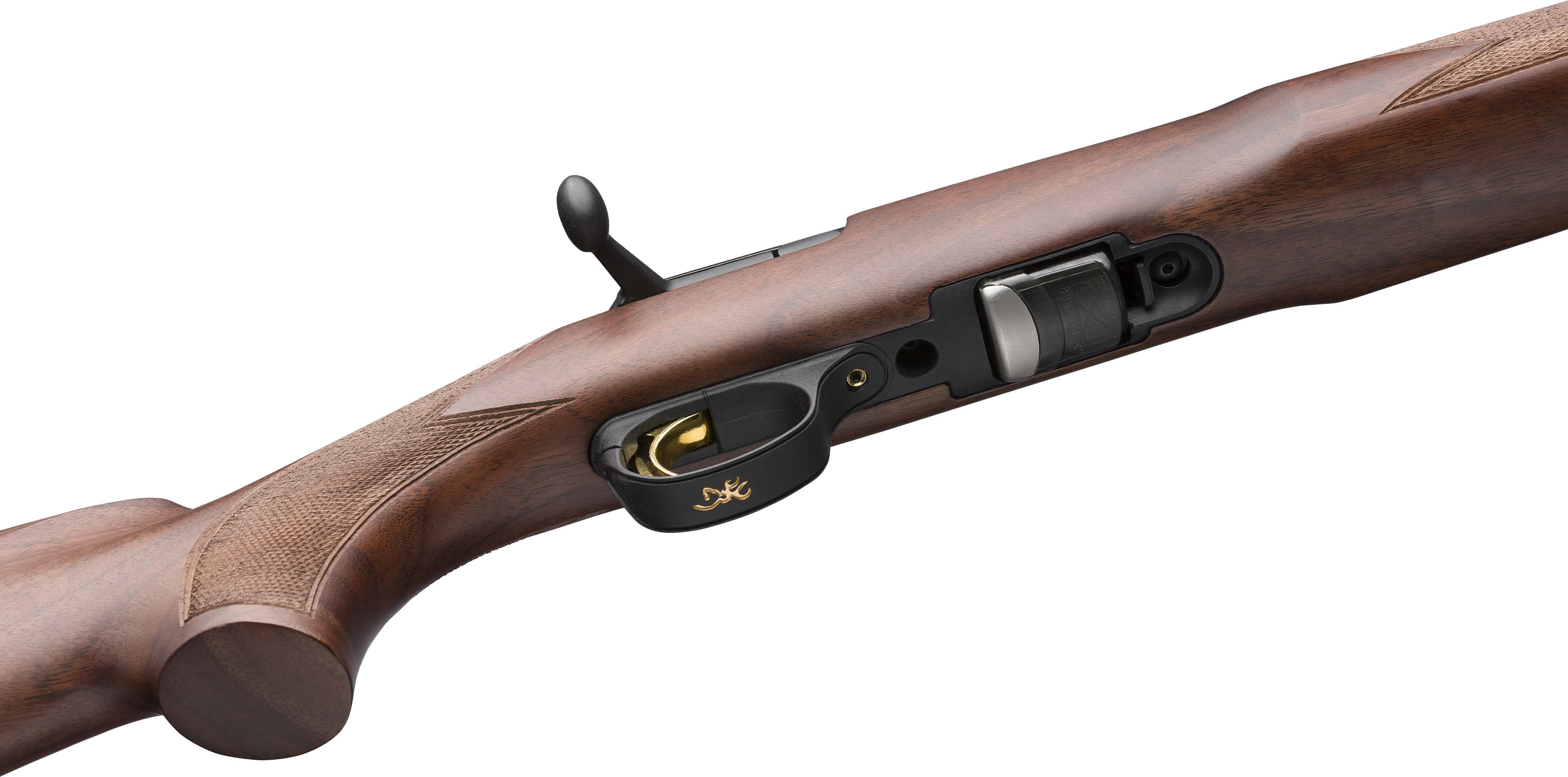 - Satin finish walnut stock with raised cheekpiece and traditional point checkering pattern