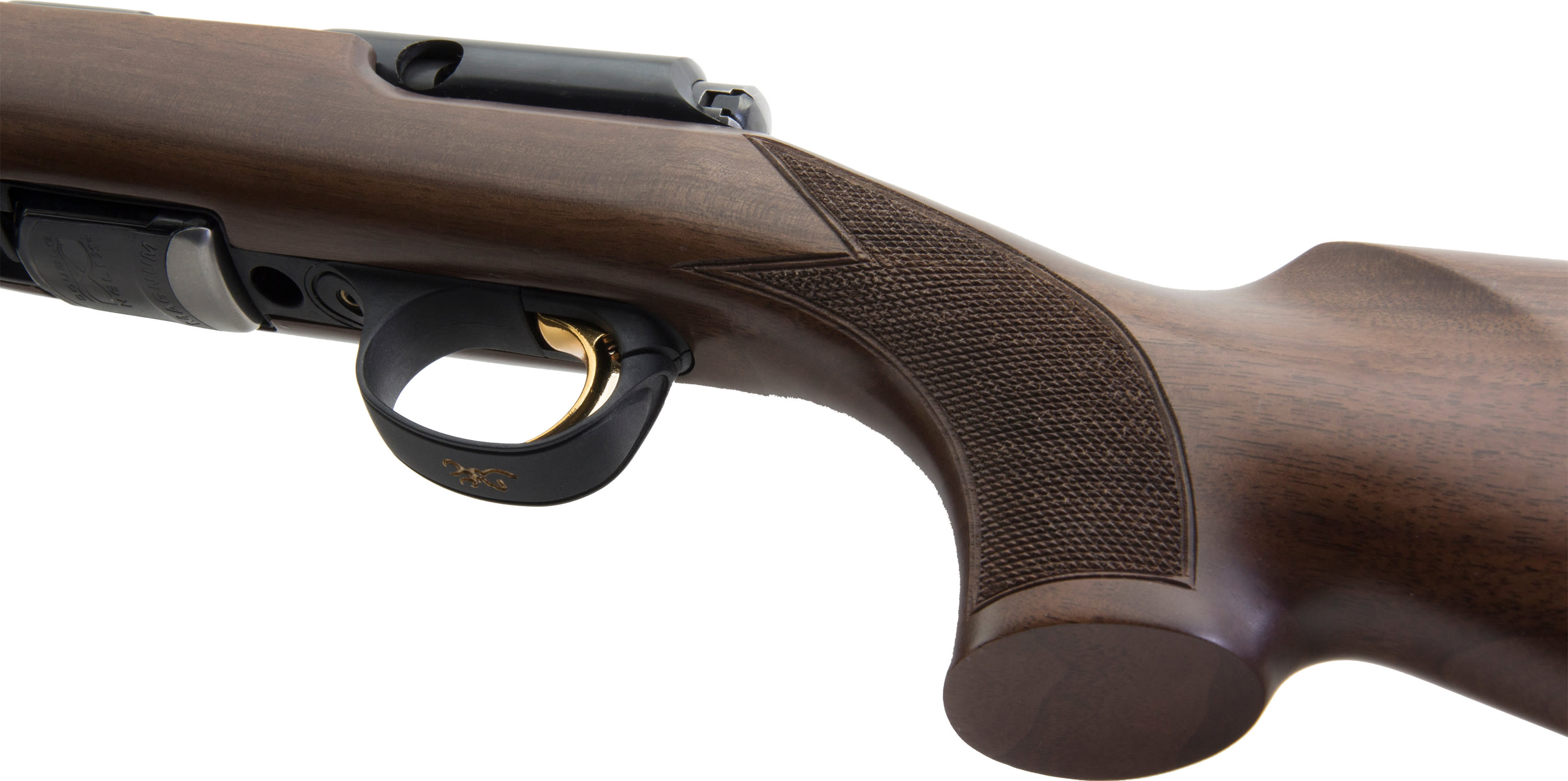 - Stock - Satin finish Walnut • Monte Carlo comb • Wide fore-end • Checkered