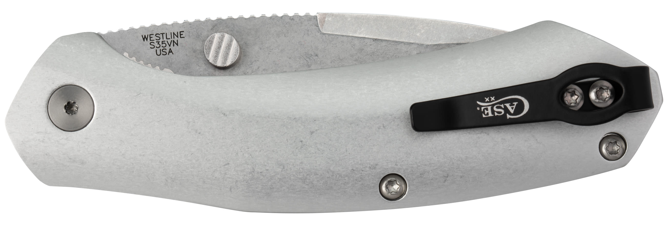 The WESTLINE™ offers an impressive mix of modern features that are hard to find in today’s competitive market. The knife is fully equipped with a stonewash finish modified drop point blade made of tough S35VN stainless steel, hard anodized aluminum scales that feel just right, an ambidextrous thumb stud and a dependably quick assisted open-and-lock mechanism. The steel clip is removable and can be attached to either side of the knife for your own everyday carrying preference. Made in the U.S.A.