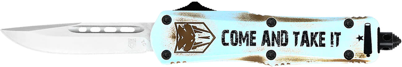 The FS-3 ''Come and Take It'' is a dual action OTF knife that begins with a high-grade aluminum alloy handle that has been cerakoted and is loaded with a high quality D2 steel blade.