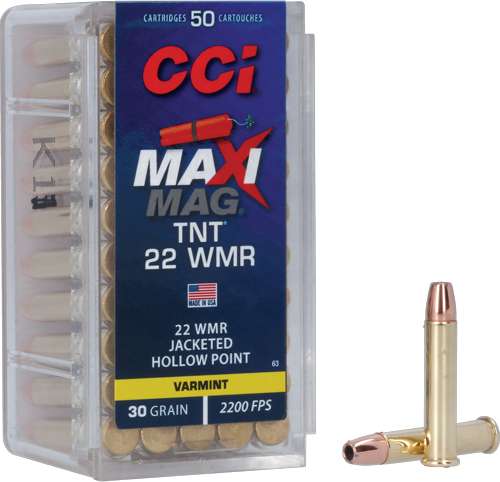 We've blended the extreme speed of our Maxi-Mag® +V 22 WMR with the performance of the TNT® bullet to utterly dominate varmints. CCI Maxi-Mag TNT loads fly flat, hit hard and expand explosively on impact. Reliable CCI priming, propellant and brass mean the utmost consistency and match accuracy.
