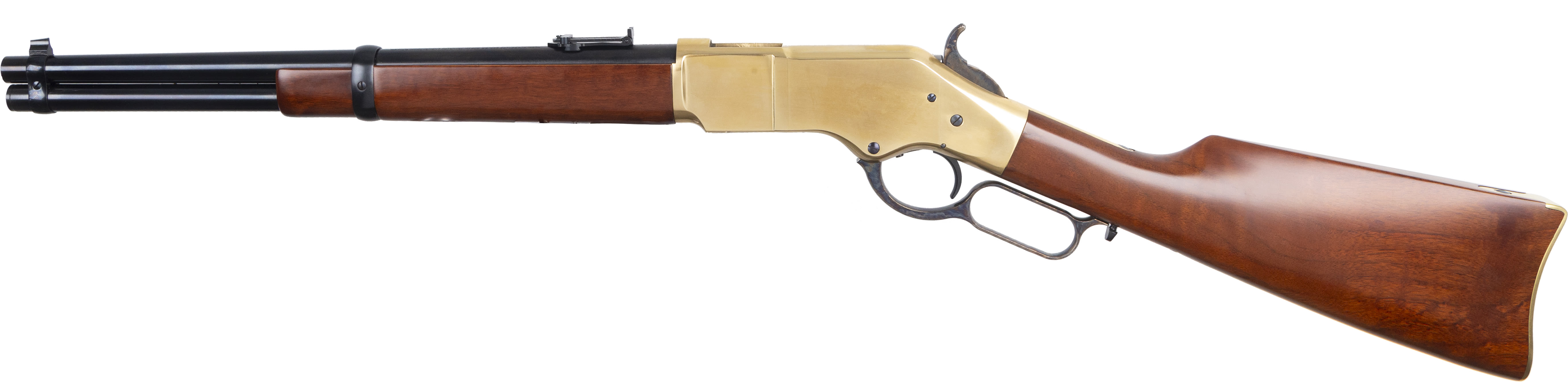 Originally known as the ''Improved Henry'' due to its patented loading gate on the side of the frame, designed by Nelson King, Winchester's plant superintendent, and the addition of a wood forearm, the 1866 model was known as the ''Yellow Boy'' by the Native Americans, because of its brass frame. The '66 model was the first true cowboy lever-action and the first that adapted well to carrying in a saddle scabbard, due to its slab sided design. With over 170,000 made between 1866-1898--it's popularity continued long after more powerful lever guns were introduced. The '66 model was famous worldwide, with guns used by the forces of Benito Juarez in Mexico, the Turkish army in their fight against the Russians and in the Wild West by such notables as Sioux Medicine Man Sitting Bull, the Union Pacific's chief engineer, General Grenville Dodge, and desperado Bill Doolin. Cimarron offers several 1866 Yellowboys, such as the 24-inch barreled Sporting Rifle, a 20-inch Short Rifle (both of these models sport octagon barrels), round barreled carbines including the 19-inch saddle ring carbine, a brass tack-decorated 19-inch Indian carbine, and a 16-inch Trapper model. Calibers available include .45 Colt, .44-40, .44 Special, .38 Special, .38-40, .32-20 and .22 Long Rifle, and with finishes like the Standard Blue, Charcoal Blue, or Original Finish, depending on which model you select. One of Cimarron's true, handsome Old West classics!