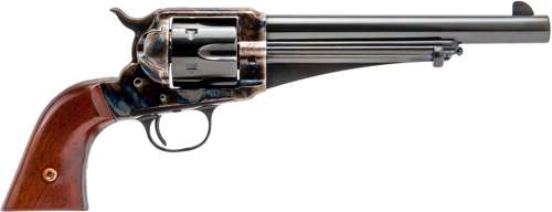 Designed to compete with Colt's 1873 single-action, the 1875 Remington revolver has a similar, yet distinctive look all its own. Around 25,000 of these sleek six-shooters were turned out from1875-1889, and were held in high esteem by many Westerners, including none other than the notorious outlaw Frank James, who praised its handling capabilities, as did noted 1880sTexas Ranger Bill McDonald. It was also the choice of the U.S. Department of the Interior, who purchased several hundred in 1883 as an issue sidearm to Indian police on frontier reservations. Cimarron's 1875 Outlaw is available in either the 5 1/2-inch or the 7 1/2-inch barrel lengths. Calibers offered are .357 Magnum/.38 Special, .44 WCF, or .45 Colt (7 1/2-inch is also offered in .45 Colt/.45 ACP with dual cylinders) The '75 Outlaw comes in Standard Blue with a color case hardened frame and hammer. Cimarron's 1875 Model has captured the looks and feel of this frontier smokewagon that has also been catching on with today's silver screen cowhands and has seen use in such popular westerns as Open Range, Broken Trail, and 3:10 To Yuma. The Outlaw is a true Western classic!