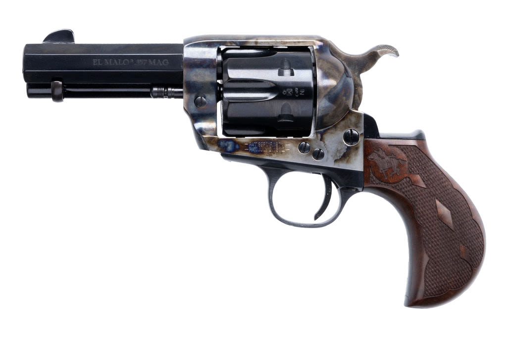 Cimarron El Malo 2 Thunderer 357 Mag 3.5'' Octagon Barrel 6 Round Capacity Model: El Malo 2 Thunderer Type: Revolver: Single Action Caliber: 357 Finish: Blue Action: Single Action Stock: Walnut 1 Piece Grip, Thunderer Grip Frame Sight: Fixed Barrel Length: 3.5 Octagon Barrel Weight: 37.6 oz Capacity: 6 Receiver: Case Colored Frame Features: Made by Pietta, Italy, Checkered Grip; Pre-War Frame, Low Wide Hammer