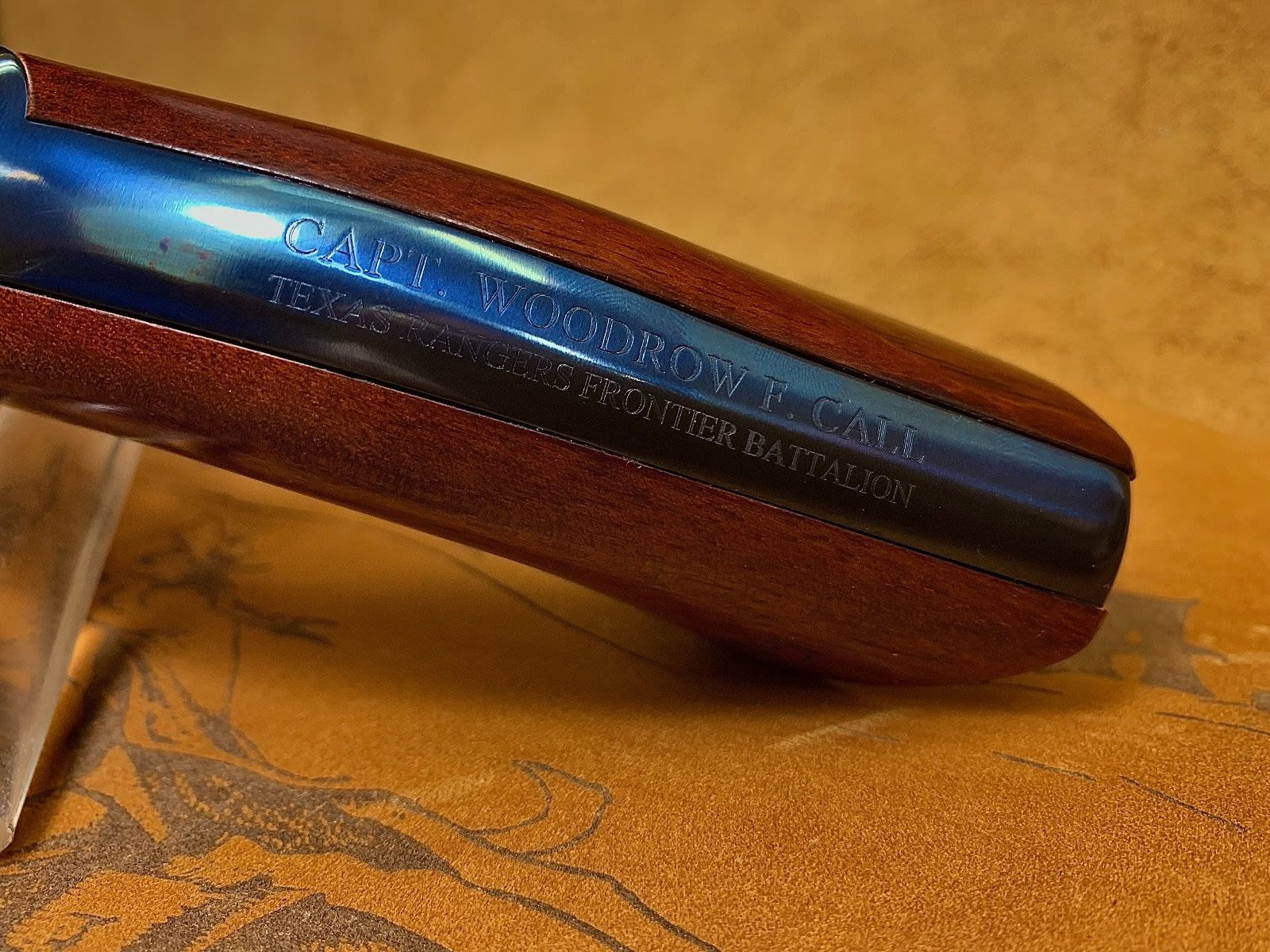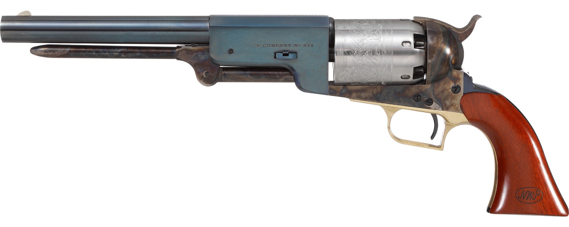 The Lonesome Dove Walker .44 features a 9-inch barrel in a charcoal blue finish, a white engraved cylinder, and case-color hardened finish on the frame and hammer. The trigger guard and grip frame are in brass, with a steel backstrap, and finely figured walnut grips sporting a cartouche. The gun is authentically marked with “Capt. Woodrow F. Call, Texas Rangers Frontier Battalion” down the backstrap and his Texas Ranger Division “E Company No. 119” on the left side of the frame and barrel.