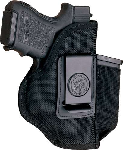 The N87 is made of premium padded ballistic nylon. The 1 3/4" sturdy, powder coated black spring clip keeps this beauty securely anchored to your belt. A spare magazine pouch is standard for the auto loader models, and they are ambidextrous. The clip may be removed and inserted on opposite side for left hand carry.