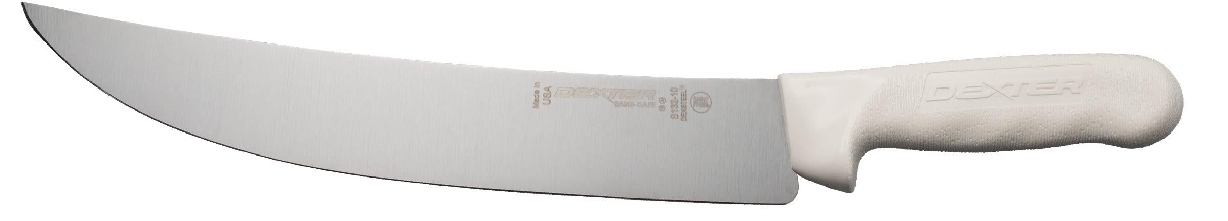 The Dexter S132-10 10'' Cimeter steaking knife features our Sani-Safe® handle and our proprietary High Carbon, High Alloy, Stain free DEXSTEEL™. Great knife for processing big fish and cuttting large pieces of meat into smaller sizes. These knives are used by professionals in fish and meat processing. Ultra sharp out of the package, it holds a great edge and is easy to sharpen. This knife is NSF certified. Made in U.S.A