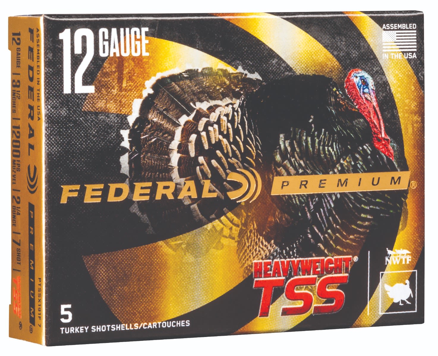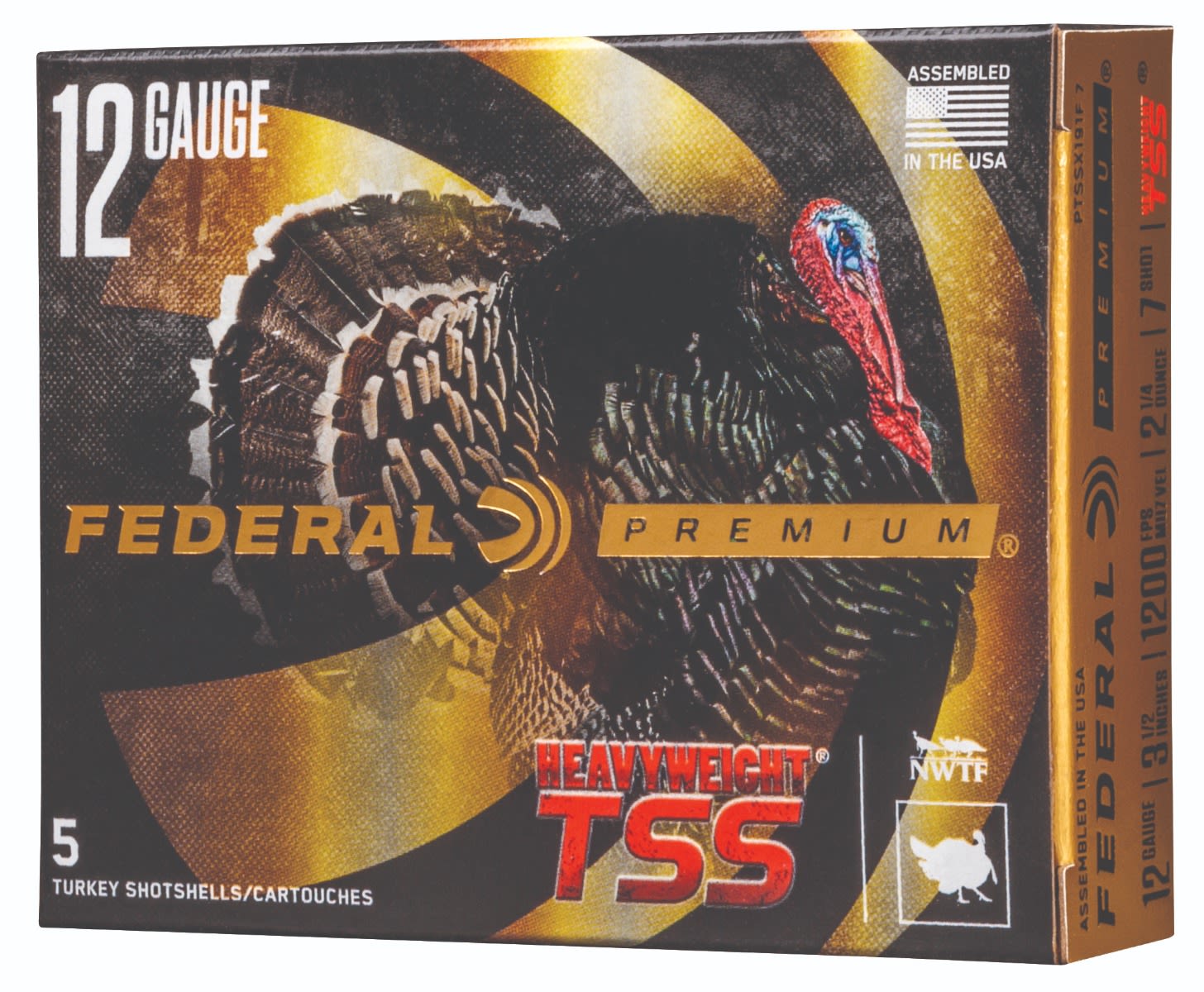 Kill gobblers at longer distances than ever before with HEAVYWEIGHT TSS. Its payloads of HEAVYWEIGHT Tungsten Super Shot provide the highest pellet counts possible. The tungsten-alloy materials 18 gm/cc density is 22 percent higher than standard tungsten and 56 percent more than lead. The result is the most energy and highest velocities at extreme range. Its rear-braking FLITECONTROL FLEX wad performs flawlessly through ported and standard turkey chokes for the most consistent, deadly patterns possible.