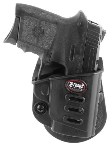 The Evolution series is the next step in the advancement of holster development. A tension adjustment screw is incorporated to allow the user to customize the ease of presentation and the security of retention, functioning with the proven Fobus passive retention design. The E2 series features one piece holster body construction, and like all Fobus holsters, the Evolution, is lightweight and includes steel reinforced rivet attachment and a protective sight channel. The paddle also includes a rubberized insert to provide both comfort and stability.