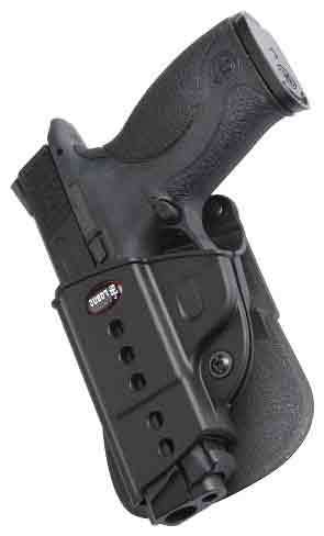 The Evolution series is the next step in the advancement of holster development. A tension adjustment screw is incorporated to allow the user to customize the ease of presentation and the security of retention, functioning with the proven FOBUS passive retention design. The E2 series features one-piece holster body construction, and like all FOBUS Holsters, the Evolution, is lightweight and includes steel reinforced rivet attachment and a protective sight channel. The paddle also includes a rubberized insert to provide both comfort and stability.