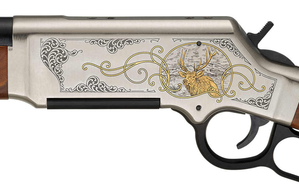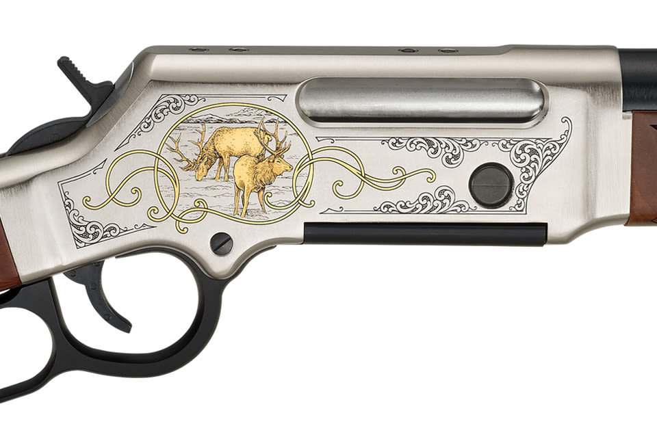 Carrying on with our popular Long Ranger series, if you're a coyote-caller, an antelope chaser, or a hard-core elk hunter, now you can order a premium grade version in any of the three standard LR calibers, with special engraving that perfectly matches your favorite game hunts. Each of the three new Wildlife Long Ranger editions uses the basic package of 7 lb weight, 20 inches round barrel, checkered walnut, straight wrist, folding adjustable rear sight and 0.062 inches ivory bead front, transfer bar safety, solid rubber recoil pad, sling swivels, and detachable steel magazine, and adds a high-polish nickel plating to the drilled and tapped lightweight alloy receiver, under scroll engraving that frames 24K gold-inlaid depictions of each animal, on both receiver flats. The Wildlife Elk in .308 Winchester depicts a majestic bull elk in a mountain setting on its left, and a grazing pair on its right flat. Who else but Henry makes it so easy to tell which is which at a glance (especially if you have all three in the family), and how cool is that, the same high-grade hunter, in the same familiar configuration, covering a wide range of game sizes and hunts.