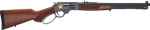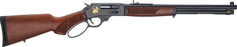 The H010GWL in .45-70 is a trim powerhouse with its 18.43” barrel under semi-buckhorn rear and tall brass bead front sights. A checkered pistol grip walnut stock, sling swivel studs, and ventilated black rubber recoil pad fill out the package. Again sharing the .45-70 brass Wildlife Edition’s engraving pattern, a 24K gold relief profile of a bear adorns the left side of the blued frame inside gold-accented scroll, line, and braided borders, with a gold relief image of a moose head on the right side.