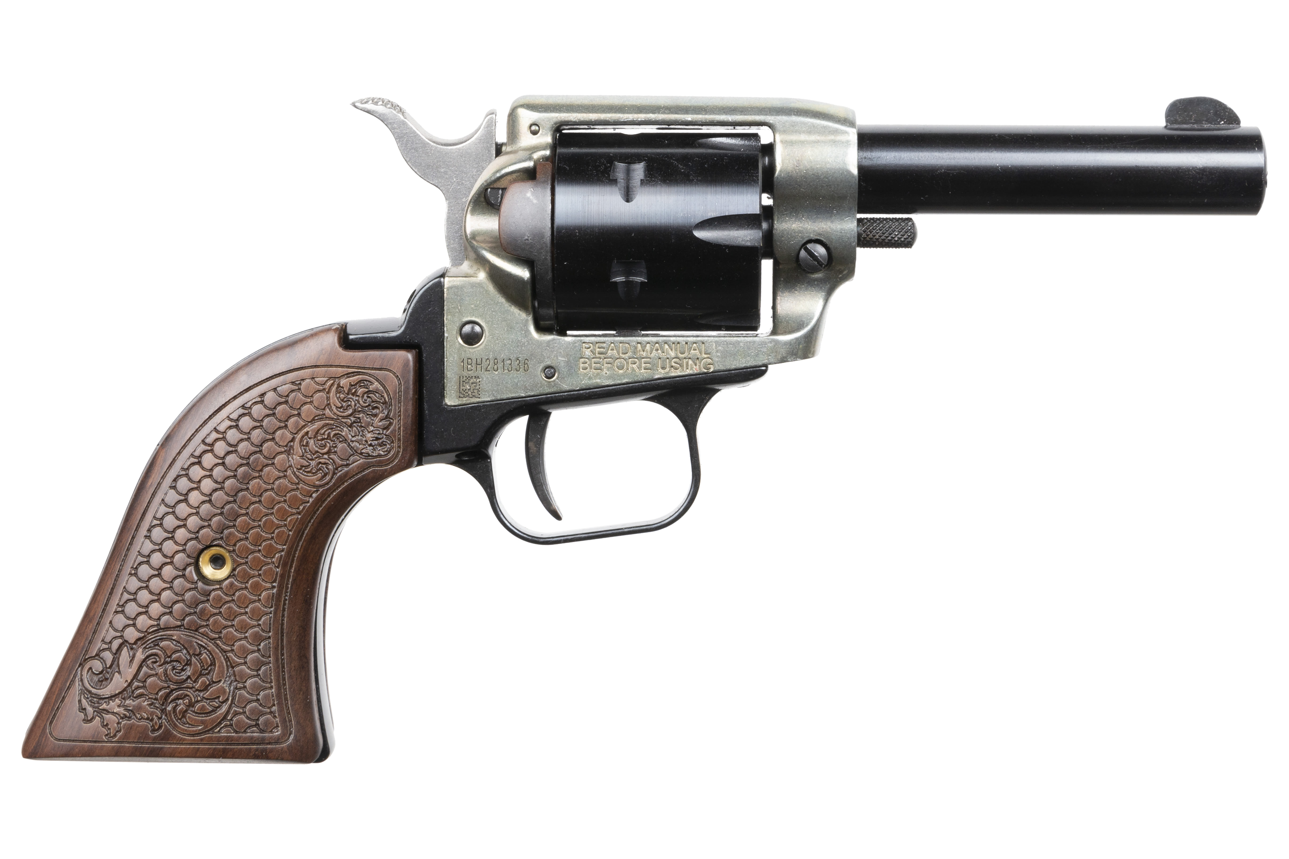 A pint-sized revolver with an Old West flair! Meet the new Heritage Barkeep. The single-action Barkeep comes chambered and ships with the affordable .22 LR rimfire cylinder. This revolver is also compatible and designed to work with an interchangeable .22 WMR cylinder option. Built for optimal concealability in a light and portable package, the Barkeep boasts fixed open sights for fast action and a clean sight picture. Grips have classic western styling to compliment the case-hardened frame finish.