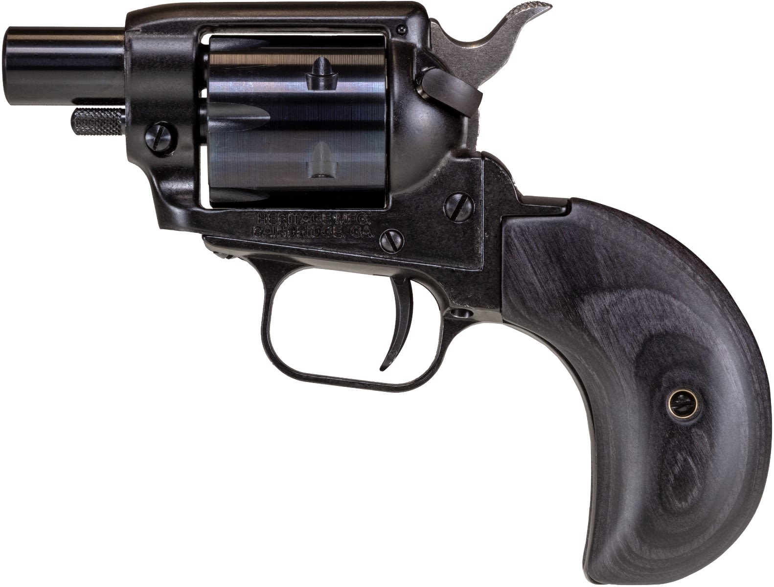 This model is offered with custom wood black grips. All revolvers come with a custom Heritage wood-handled ejector rod for removing empty cartridge cases.