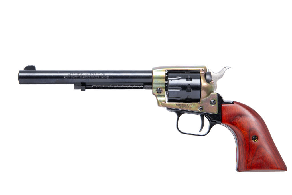 Born of the traditions of the Old West, the Heritage Manufacturing Rough Rider® Revolver with Interchangeable Cylinders maintains much of the look and feel of the legendary Single Action Army revolver, only in a scaled down version. The Rough Rider is manufactured using state-of-the-art precision machinery that assures its accuracy and reliability. The cylinder lock up is tight, and the perfect timing of the action makes for a handgun that will put its shots where you want 'em. A hammer block mounted in the recoil shield provides extra protection and has a red dot indicator that lets you know when the gun is ready for action.