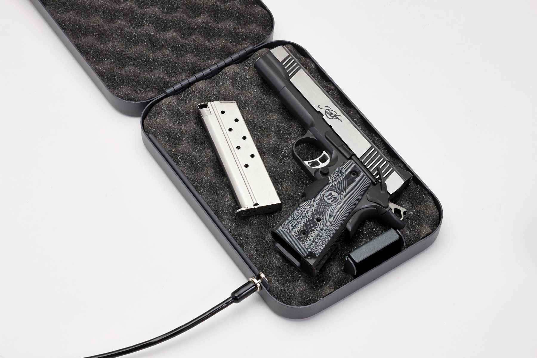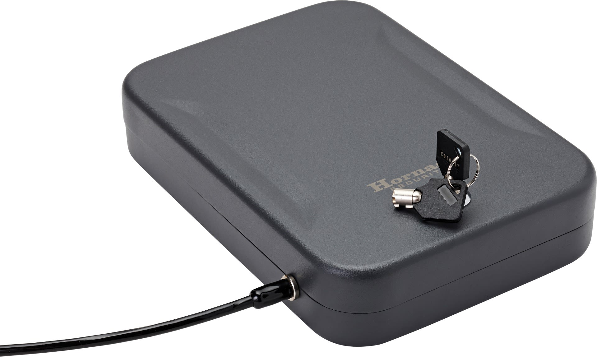 Hornady Security® Lock Boxes provide secure storage for handguns and other valuables at home, on a nightstand, in the car, or when traveling. All Hornady Security® Lock Boxes come with a heavy duty 1500 lb. rated steel cable that secures to any stationary object including a vehicle seat or heavy piece of furniture. The patented, space-saving receiver of the cable allows maximum storage space inside the box. Lock Boxes also provide security for concealed carry permit holders.