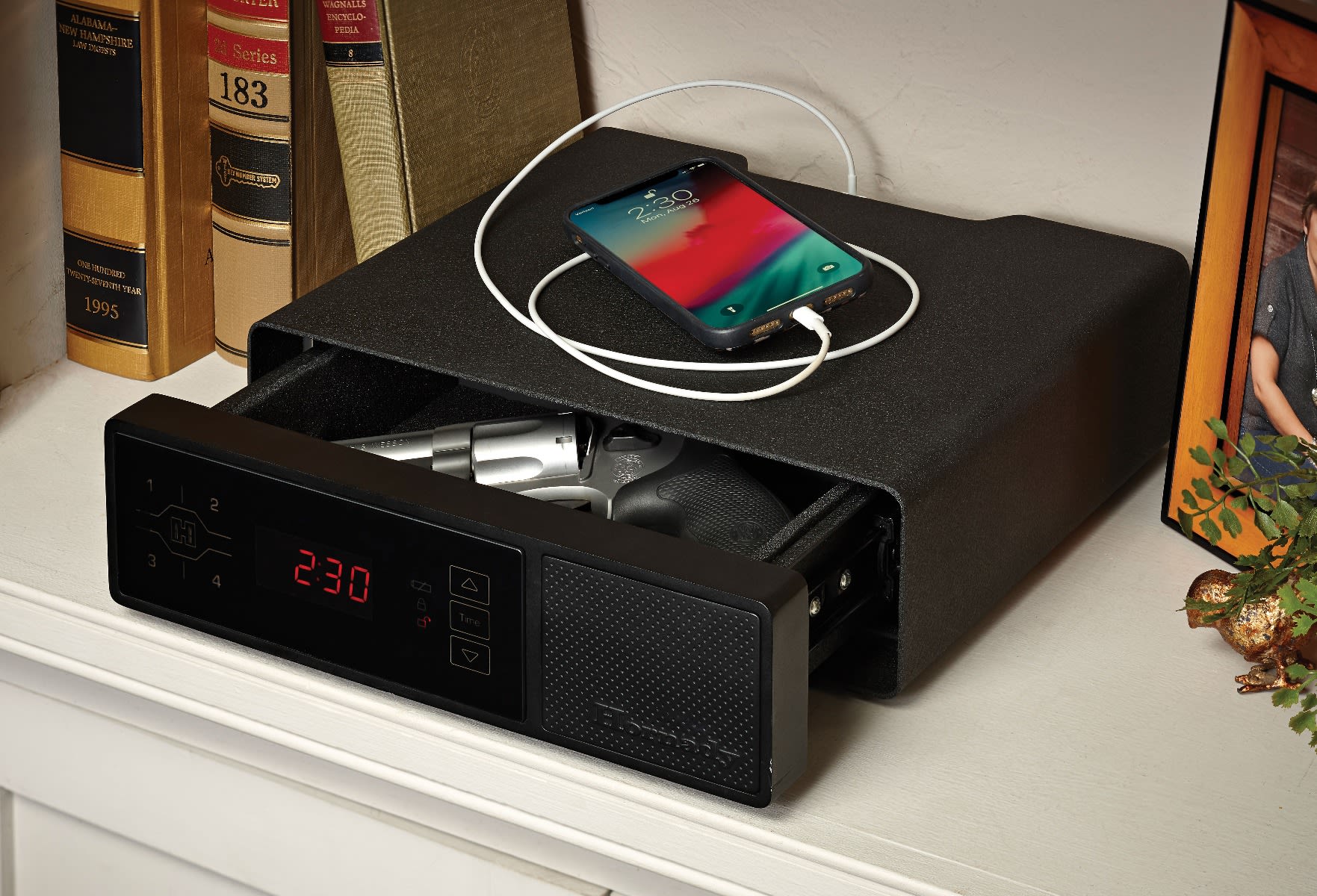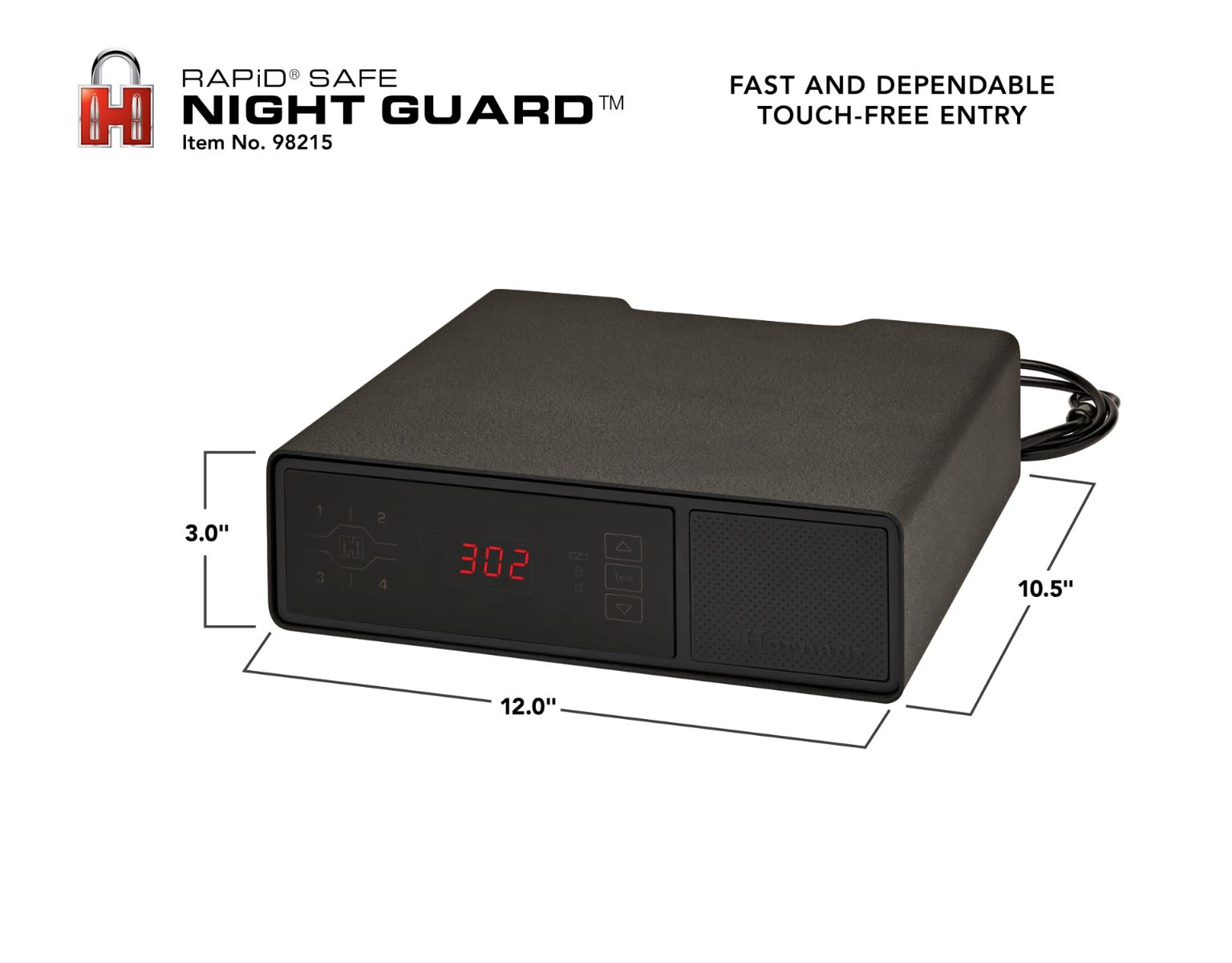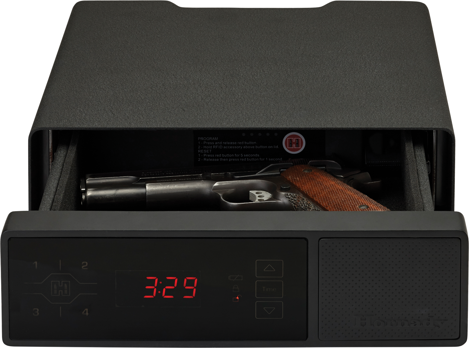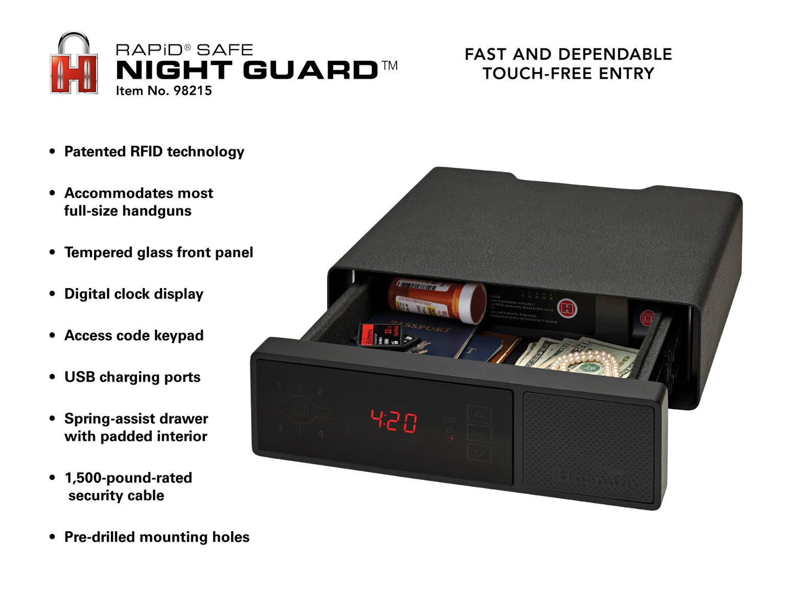 Hornady® introduces the perfect bedside companion. The RAPiD® Safe Night Guard® keeps your handgun as close as your nightstand. RFID technology offers the quickest, most dependable access to your firearm while providing unmatched security from unauthorized users. Plus, the Night Guard® offers the additional functionality of a clock and USB charging ports.