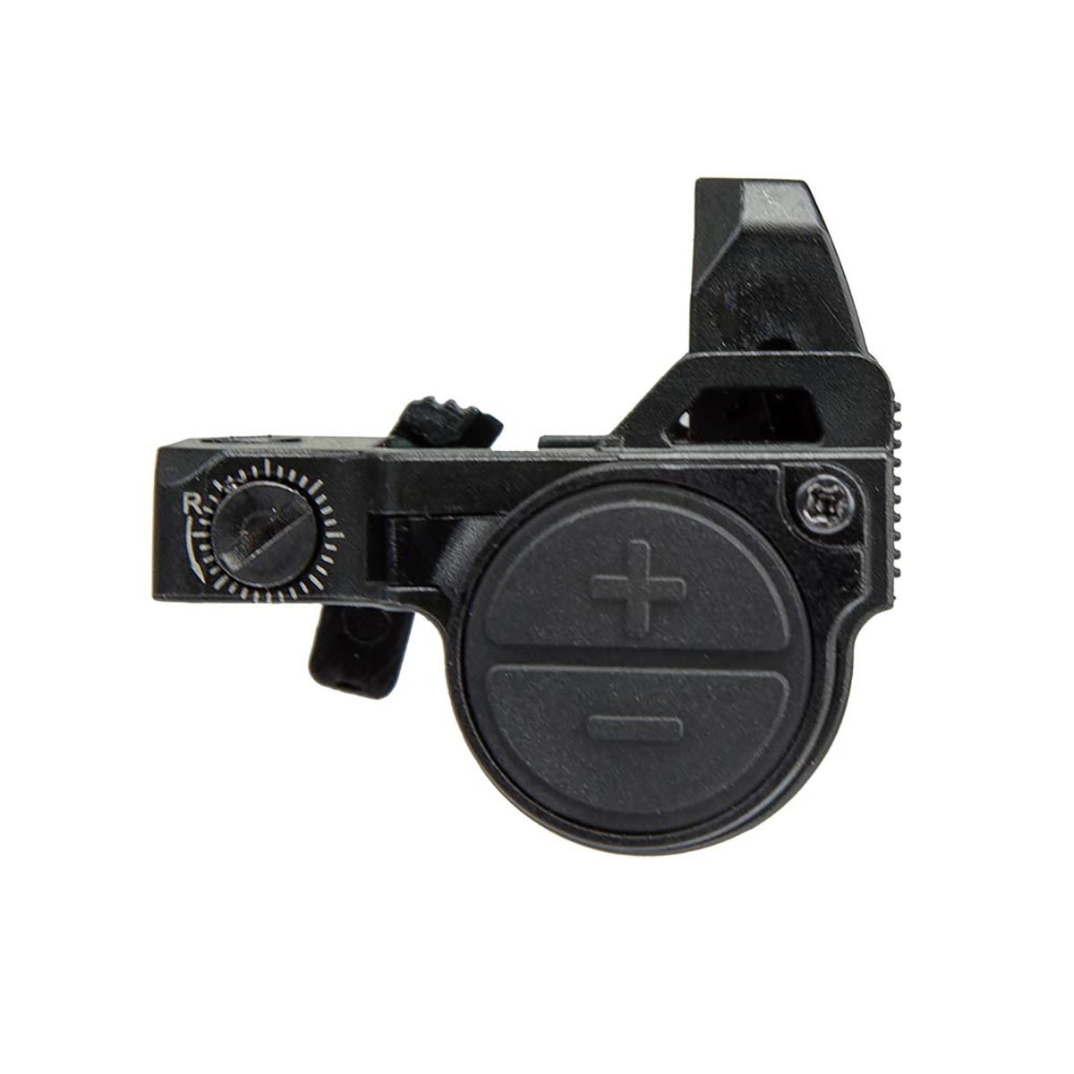 Flipdot Pro is powered by a CR2032 type battery (included). The battery compartment is located on the side of the optic vertically. You can change the battery without affecting the optic's zero. The battery compartment has a + button for increasing the red dot brightness and a - button for decreasing the brightness level of the red dot. There is 5 brightness levels for the red dot reticle.