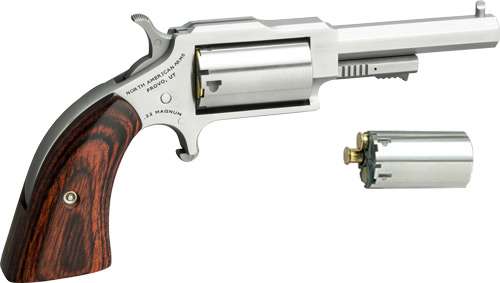 Our 1860 Series, also known as “The Earl”, “The Hogleg” and “The Sheriff” are five-shot, single action, 1860’s- styled mini- revolver chambered in 22 Magnum. Named after the NAA gunsmith who originally developed the product, with it’s faux loading lever (which secures the cylinder pin), “The Earl” resembles a 150 year old percussion revolver then common in the Old West. With it’s heavy octagonal barrel, top strap channel and bead front sight, “The Earl” could become your favorite plinker (pray for the snake, rodent, or tin can that dares cross your path!). With available flap-holster made of belt grade leather, strap on “The Earl” for an imaginative trip back to a simpler time.