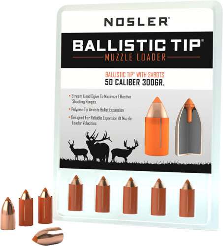 The Ballistic Tip MZ was created by Nosler to bring legendary Ballistic Tip rifle bullet accuracy and terminal performance to today's generation of high-performance muzzleloading rifles. This bullet has an orange polymer tip and a streamlined ogive to maximize effective shooting range. The polymer tip also assists in initiating bullet expansion upon target impact, which is a signature of the Ballistic Tip line. Created specifically for the lower velocities generated by muzzleloading rifles, the Ballistic Tip MZ provides reliable expansion and deep penetration over a broad range of velocities.