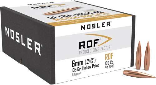 For those wanting to squeeze the most performance from their competition rifle, Nosler's RDF (Reduced Drag Factor) match bullet line is the ideal choice. The RDF line was designed from the ground up to provide exceptionally high BCs, which create the flattest trajectory and least wind drift possible. The keys to the RDF's outstanding performance are Nosler's meticulously optimized compound ogive and long, drag-reducing boattail, which make handloading a snap and create an incredibly sleek form factor. RDF bullets also have the smallest, most consistent meplats of any hollow point match bullet line, so there is no need to point or trim tips.
