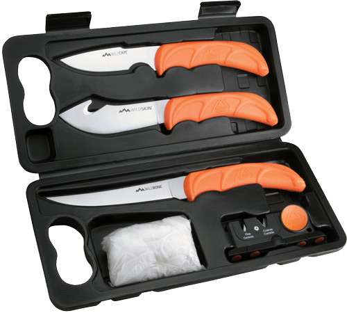 Our lightest most compact knife set with hard-side carry case is perfect for field use and home processing. Weighing just 20 ounces this complete 6-piece set includes a full-tang caping knife gut-hook skinner boning/fillet knife game cleaning gloves and two-stage ceramic/carbide sharpener to maintain a razor edge at all times. The 420J2 stainless steel blades are precisely heat treated and hand finished shaving-sharp. Rubberized blaze-orange TPR handles offer high visibility in the field and ensure a non-slip grip even when wet. Additionally the elk horn inlay provides extra indexing points for greater control and prevent fatigue during long use. Ensure the quality of the meat for your family and save the cost of commercial processing with the Wild-Lite. - Caper Blade: 2.5