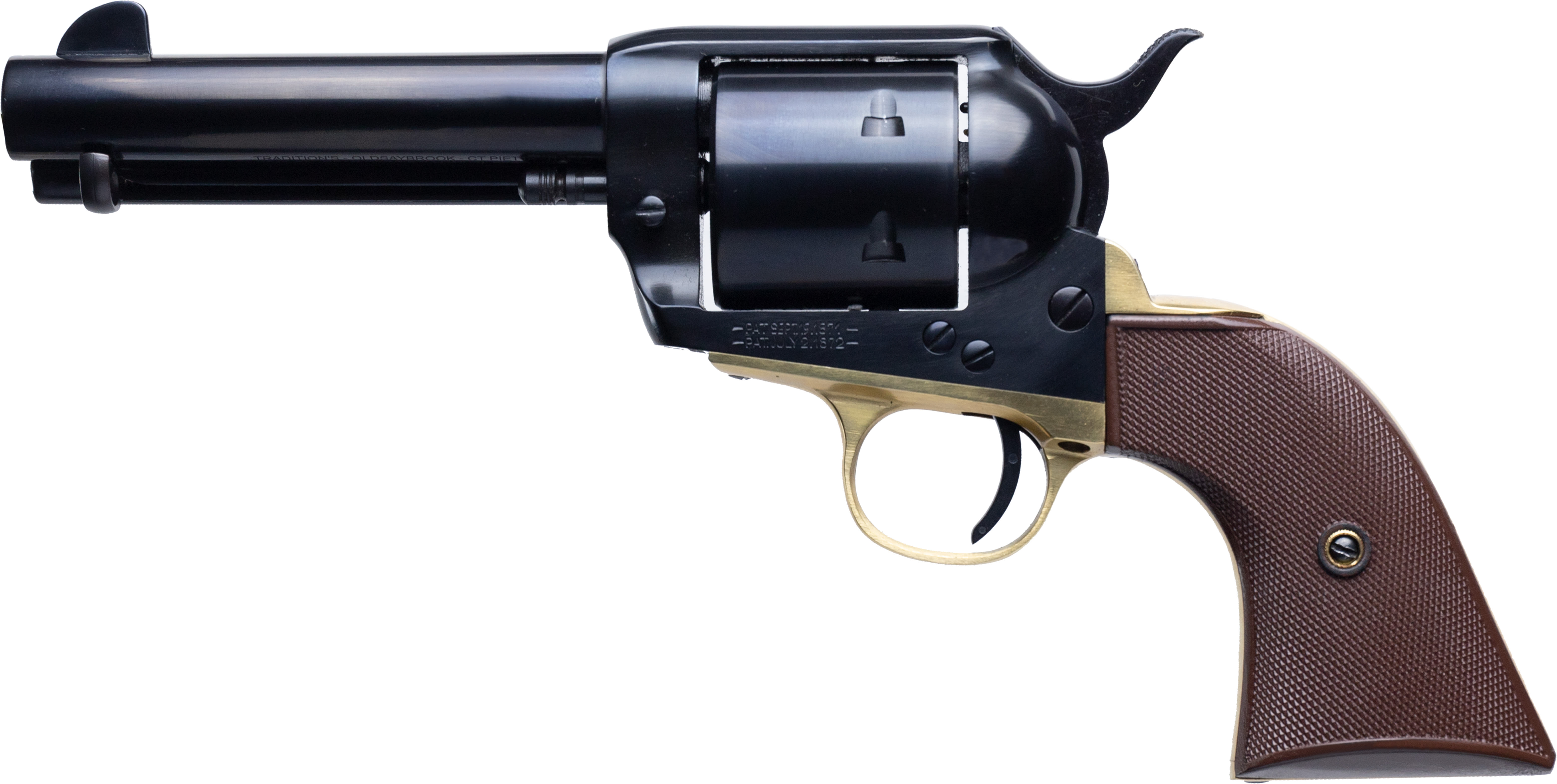 Davidson's Exclusive: Deep Blued Finish Frame, Non-fluted Cylinder and Barrel. High‐polished Brass Trigger Guard, Front Strap, and Back Strap, Two-piece Grip