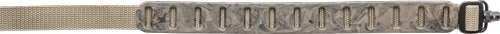 The claw rifle sling utilizes the latest in soft touch materials. The durable non slip polymer pad is molded directly onto the sling webbing and will allow approximately 1/2'' of stretch. As an added value the claw rifle sling comes with patented hush stalker II sling swivels which will not squeak rust or rattle and are 2 1/2 times stronger and lighter than conventional metal swivels. These swivels fit all standard studs and will not dent or mar the finish on your stock