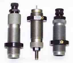 RCBS's 3-Die Carbide Sets is for straight-wall rifle and pistol cases. The Carbide Sizer Die sizes the case and de-primes (the carbide sizer ring eliminates the need to lubricate). Its Expander Die expands the case to the proper diameter to accept the bullet, and it imparts case mouth flare/bell for bullet feeding. The Seater Die seats the bullet and roll crimps.