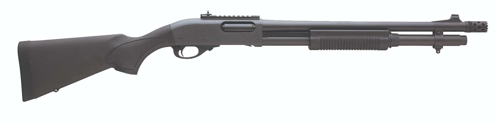 Built on our legendary pump action that's become the gold standard for high-risk applications, the Model 870™ Express Tactical with a quick pointing 18 1/2'' barrel and includes our extended ported Tactical Rem Choke. It packs a full 7 rounds of 2 3/4'' or 3'' 12-gauge firepower with the factory installed 2-shot extension.