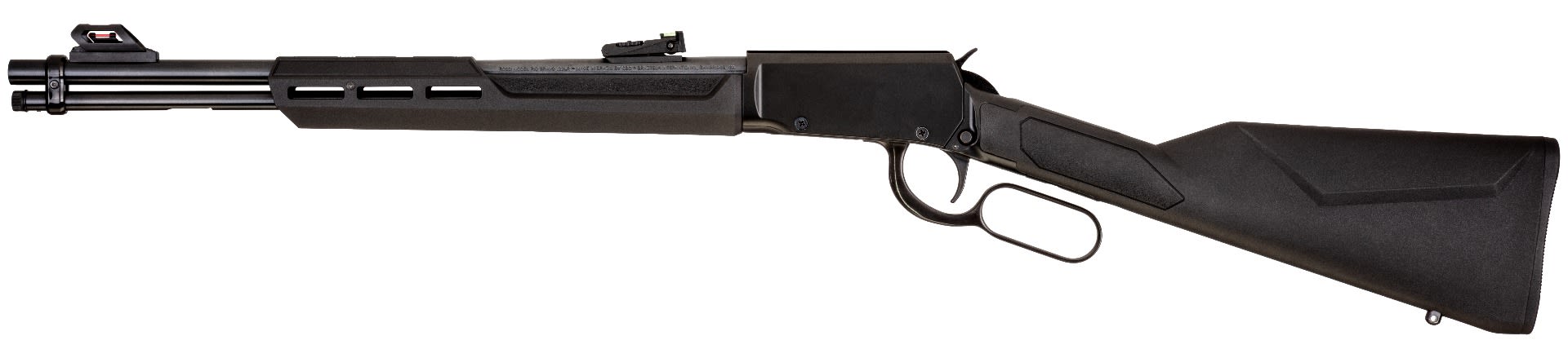 The Rossi Rio Bravo is based on the company's popular line of R92 lever-action firearms. Featuring a rugged black polymer forearm and stock with polished black metal finish, the Rio Bravo brings the traditional rifle experience to the rimfire category. The Rio Bravo is well-suited for small-game hunting, adventurous target shooting, around-the-farm pest control, and can be used for Compact training.