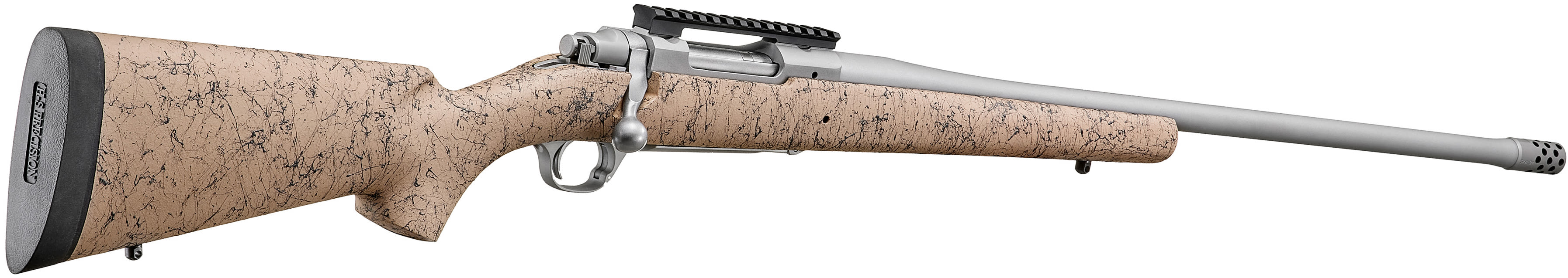 Ruger Hawkeye, FTW Hunter, Bolt Action Rifle, 6.5 Creedmoor, 24" Cold Hammer Forged Barrel, Threaded 5/8x24, Ruger Muzzle Brake System, Matte Stainless Finish, Silver, LC6 Trigger, 20 MOA Picatinny Rail, Pro Series HS Precision Tan/Black Synthetic Speckled Stock, Silver, 4 Rounds, Includes Studs for Mounting Sling Swivels 57152