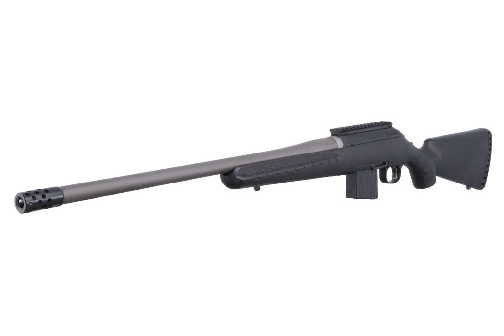 The Ruger American Rifle® Predator is built with innovative designs and modern materials to provide shooters with a practical and cost-effective bolt-action rifle, meant for serious long-range shooting. Ruger designed the Marksman Adjustable™ trigger for the American Rifle to be user adjustable for weight-of-pull. The Marksman trigger is light and crisp, allowing for precision shooting. The stock is constructed from rugged composite with grooves and texturizing on the pistol grip and fore-end, which provide a solid, non-slip grip in any hunting environment. The stock features molded-in Power Bedding® recoil/bedding blocks to rigidly attach the barreled action to the stock and free-float the barrel. A soft rubber recoil pad absorbs recoil considerably. The Predator model features a heavier tapered barrel to aid in long-range shooting, and is threaded (5/8''-24). The barrel is cold hammer-forged, resulting in ultra-precise rifling for exceptional accuracy. A 3-lug bolt design with a 70 degree bolt lift provides plenty of clearance between the bolt handle and the riflescope. A 2-position tang safety is easily accessible and quick to operate by both right- and left-handed shooters; the bolt can be cycled for loading and unloading the rifle with the safety engaged. A cocking indicator at the end of the bolt can be seen and felt. This American Rifle Predator model comes with one detachable, ultra-reliable, flush-fit magazine, adding to the rifle's ease of handling. The receiver is drilled and tapped with a factory installed, 1-piece aluminum, sight rail. Made in USA.