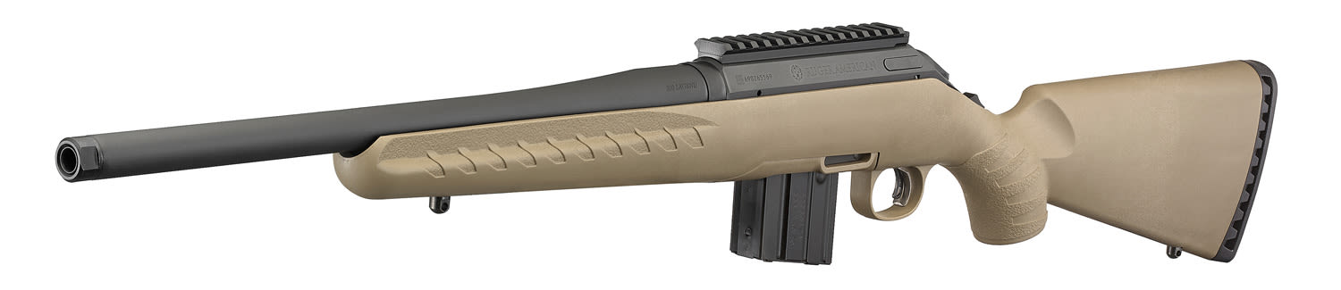The Ruger American® Rifle Ranch is built with innovative designs and modern materials to provide shooters with a practical and cost-effective bolt-action rifle, meant for fast shooting with precise shot placement. Ruger® designed the Marksman Adjustable™ trigger for the American Rifle that is user adjustable for weight-of-pull. The Marksman trigger is light and crisp, allowing for precision shooting. The stock is constructed from rugged composite with grooves and texturizing on the pistol grip and fore-end, which provide a solid, non-slip grip in any environment. The stock features molded-in, Power-Bedding® recoil/bedding blocks to rigidly attach the barreled action to the stock and free-float the barrel. A rubber recoil pad absorbs recoil considerably. The Ranch model features a shorter barrel to aid in quick handling, and comes threaded (1/2''-28) for aftermarket accessories (comes with thread protector). The barrel is cold hammer-forged, resulting in ultra-precise rifling for exceptional accuracy. A 3-lug bolt design, with a 70º bolt lift provides plenty of clearance between the bolt handle and the riflescope. A 2-position tang safety is easily accessible and quick to operate by both right- and left-handed shooters; the bolt can be cycled for loading and unloading the rifle with the safety engaged. A cocking indicator at the end of the bolt can be seen and felt. The American Rifle Ranch Bolt-Action Rifle comes with a drilled and tapped receiver, mounted with a Picatinny rail. Made in USA.