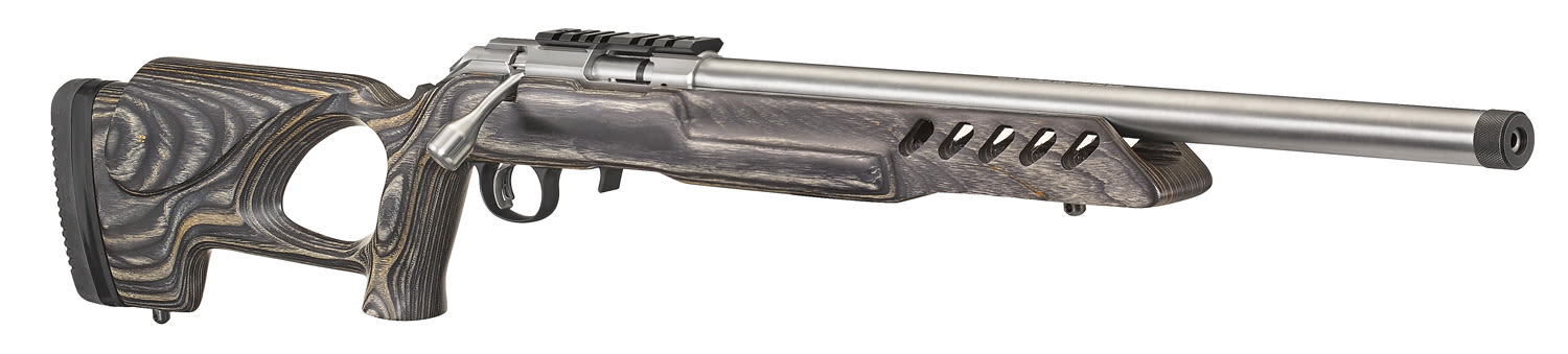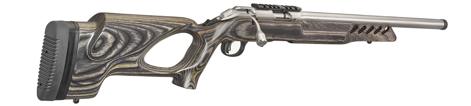 Black laminate stock features an a thumbhole in addition to sling swivels front and rear, to help you steady your aim whether shooting off of sticks, a bipod, or sling. Rubber buttpad anchors the rifle at the rear.