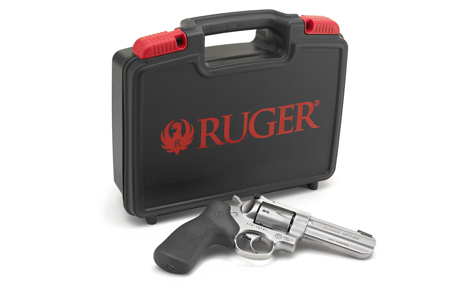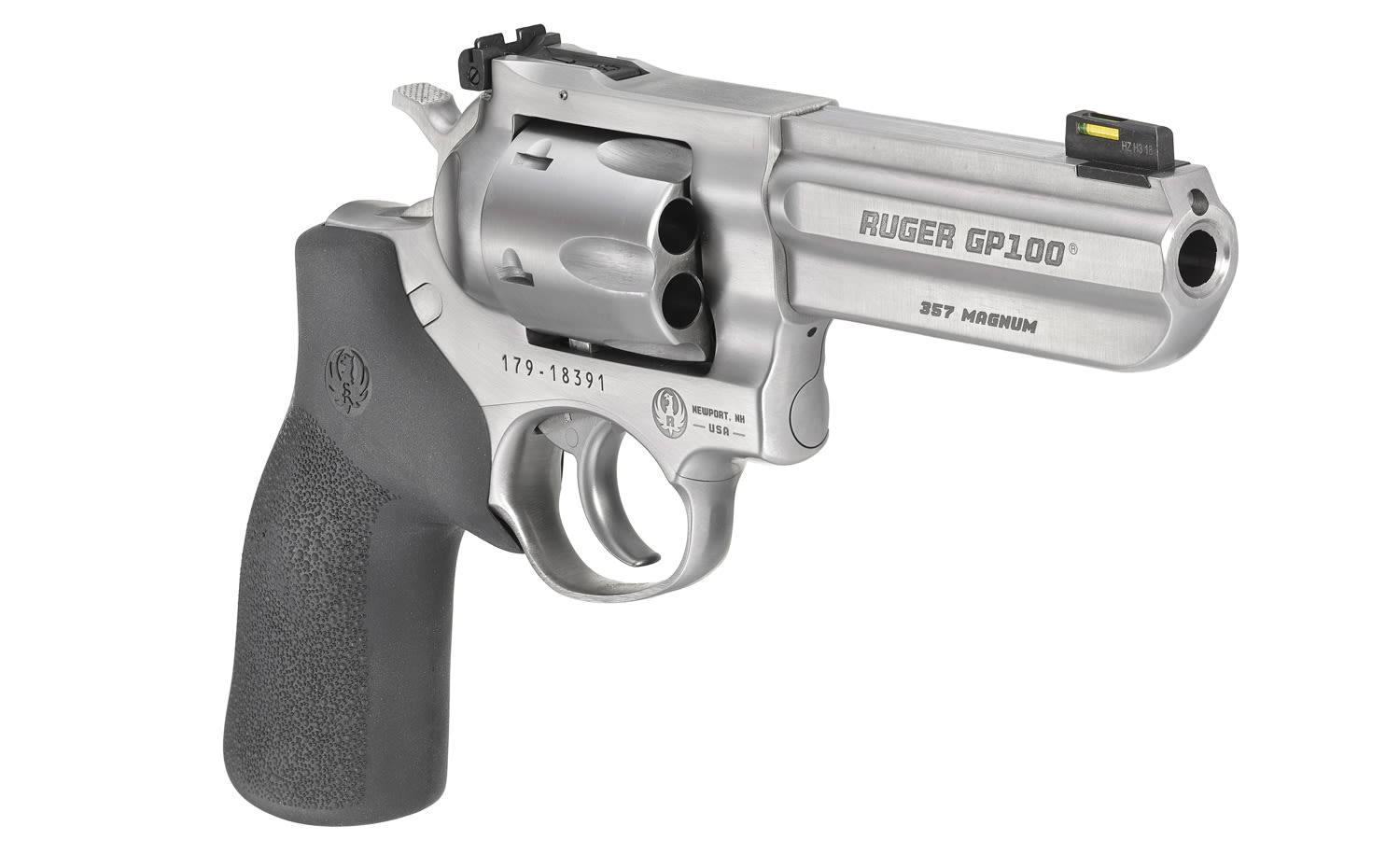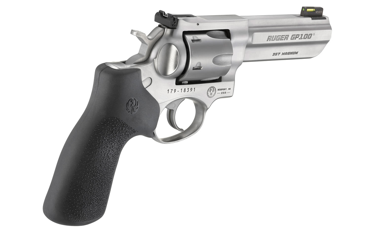 The Ruger GP100 is the next step in the evolution of Ruger revolvers. The GP100 features a triple-locking contoured cylinder that is locked into the frame at the front, rear and bottom for more positive alignment and dependable operation shot after shot and enables easy re-holstering. The ejector and chamber mouths have a light chamfer to aid loading. The Ruger GP100 features a Hogue stippled hardwood grip but the design easily accommodates a wide variety of custom grips.