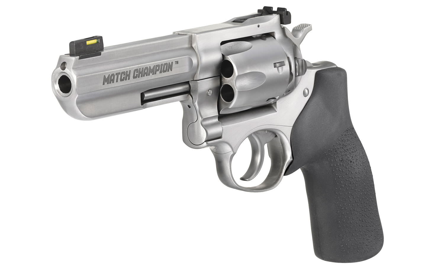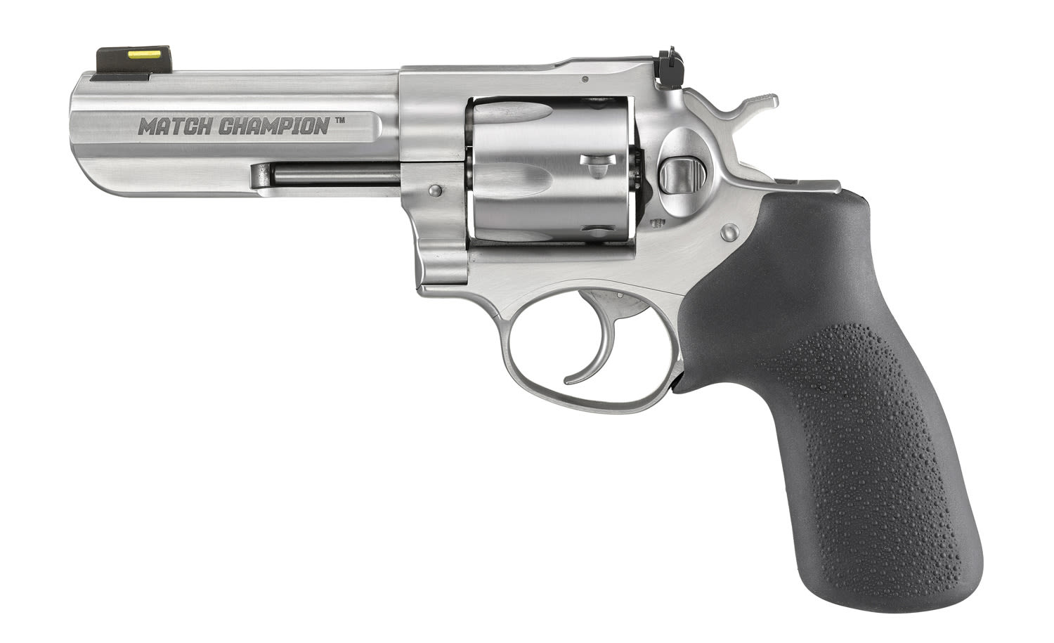 A custom Hogue hardwood grip with stippled sides permits an ideal grip for competition shooting.