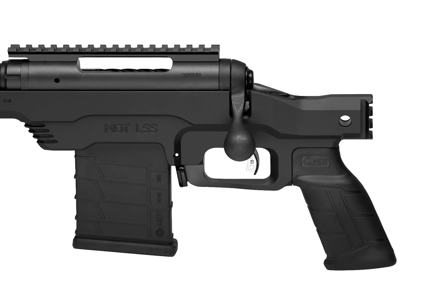 - Machined aluminum, 1-piece chassis with 7” free floating modular forend with Mlok slots and Cerakote