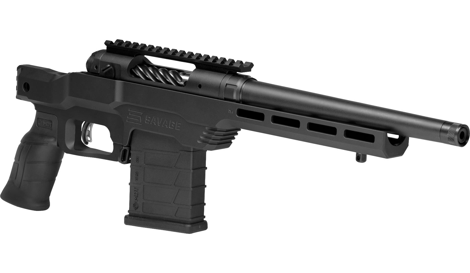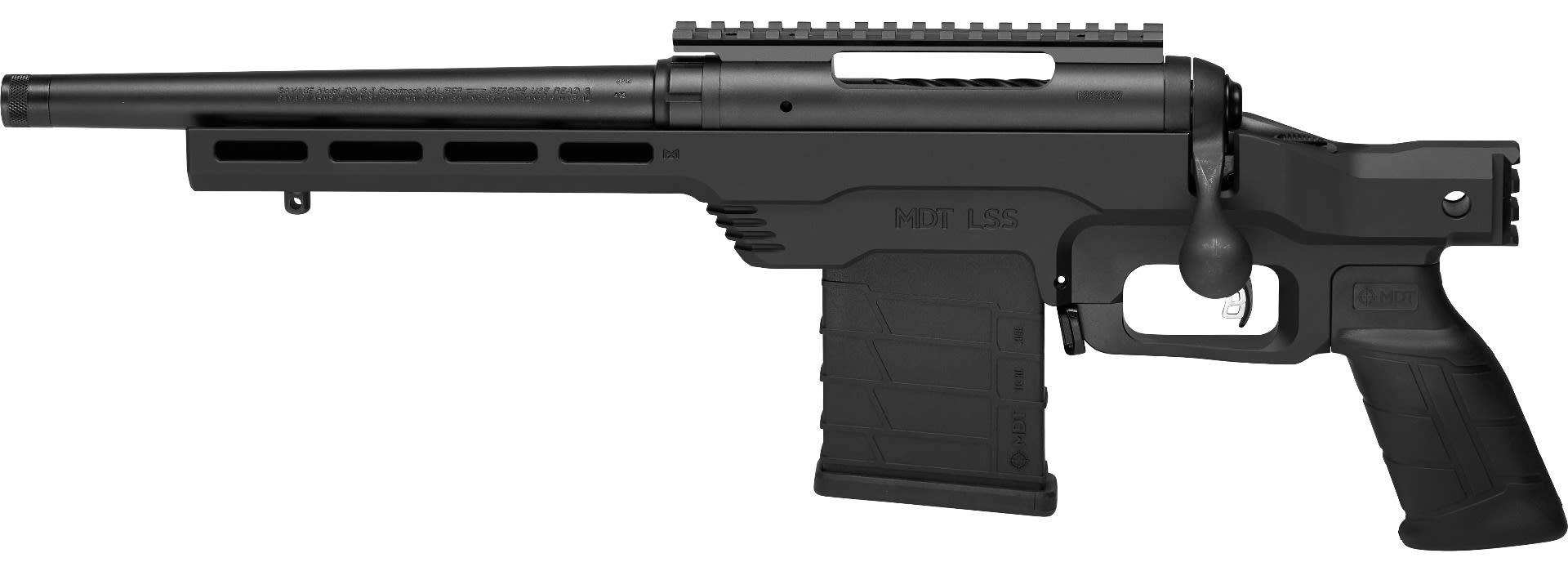 - Machined aluminum, 1-piece chassis with 7” free floating modular forend with Mlok slots and Cerakote