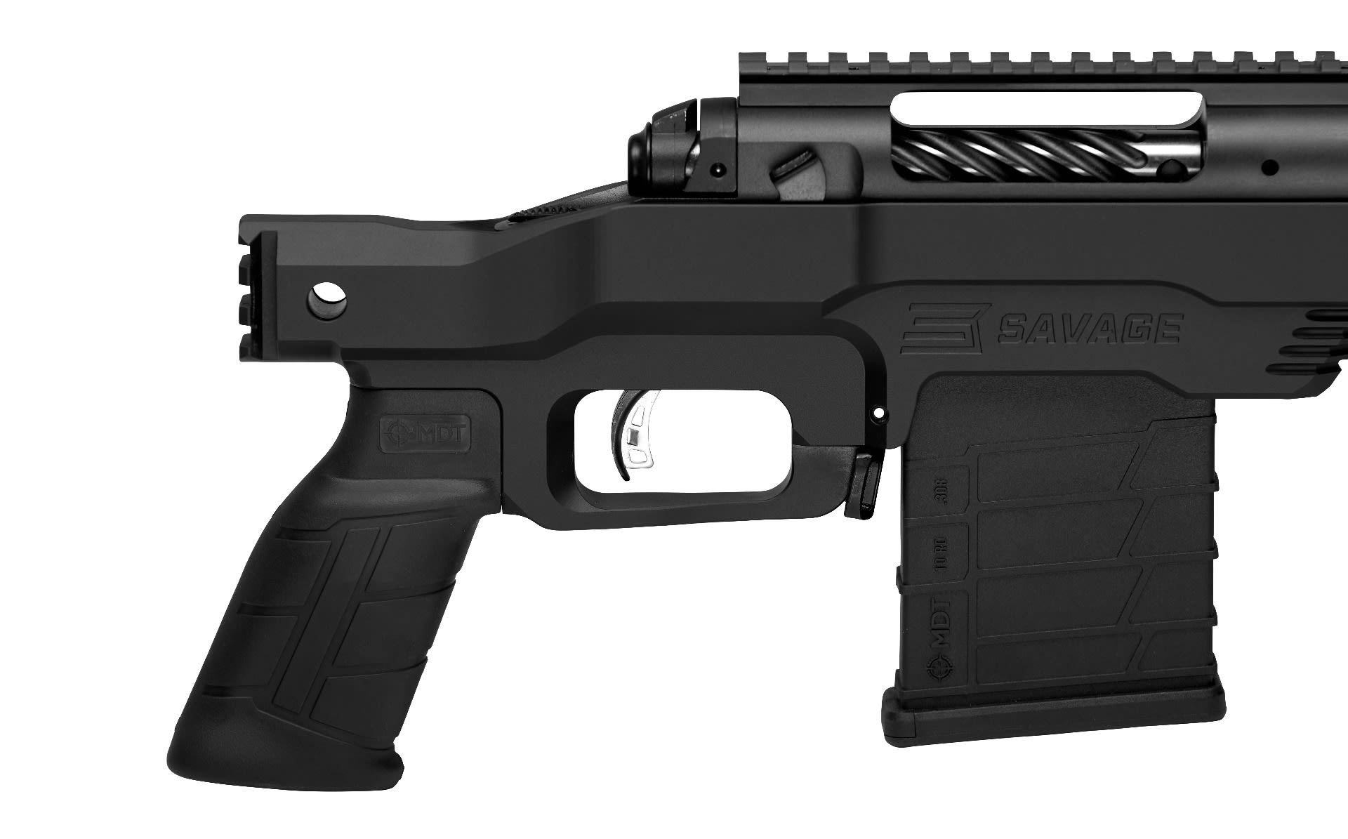 - Machined aluminum, 1-piece chassis with 7” free floating modular forend with Mlok slots and Cerakote