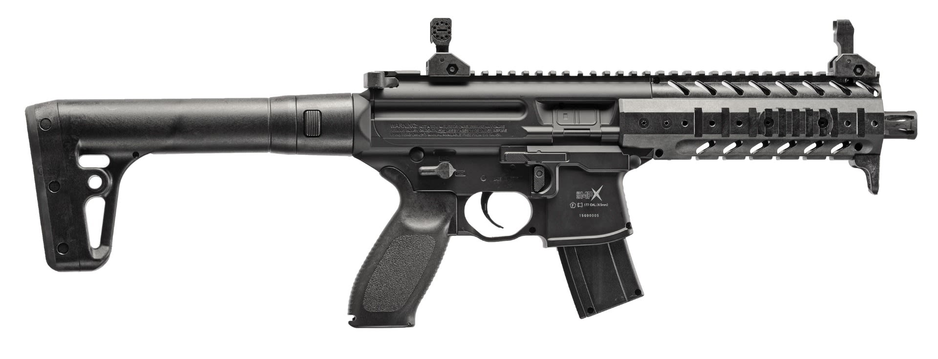 The SIG MPX redefined modern pistol caliber SBRs, and this ASP version does no less for CO2 rifles. Matched to original model weight, balance and controls, the SIG MPX ASP airgun puts more accurate performance into more accessible practice. Chambered in .177 pellet, features include 8'' rifled steel barrel, synthetic handguard, picatinny rail, tactical front grip, flip-up front and rear sights.