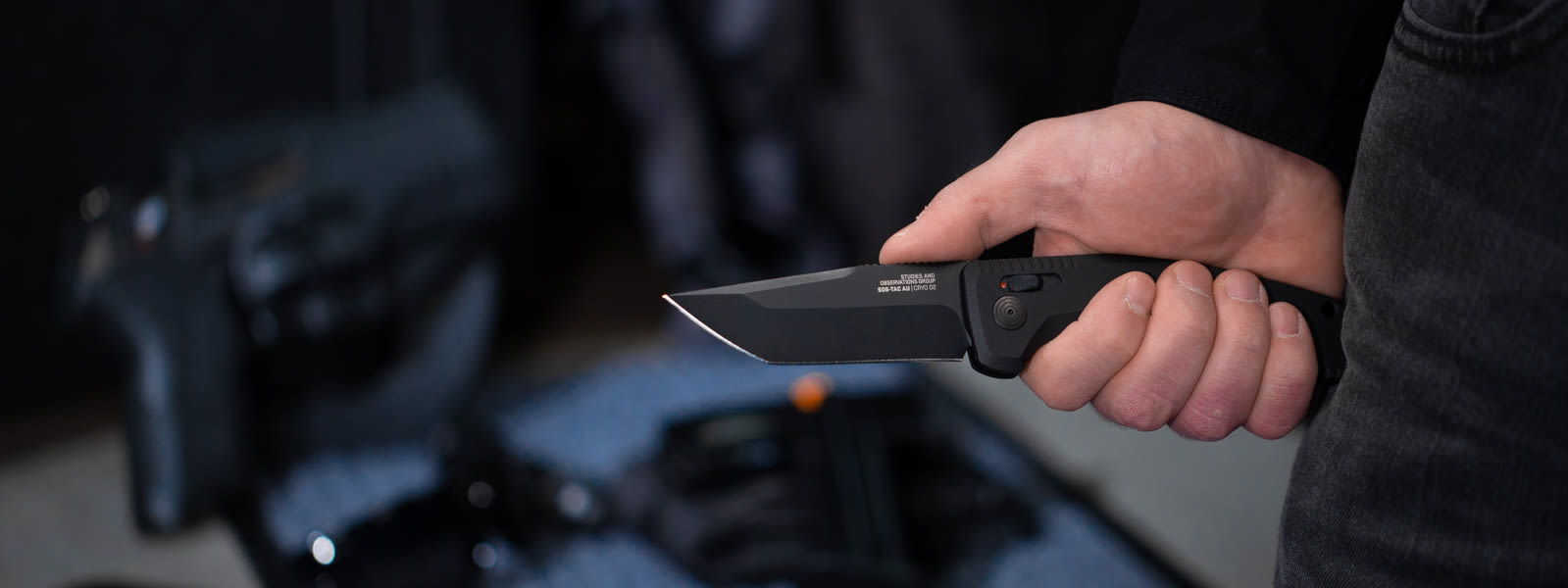 With a textured aluminum handle and CRYO D2 blade, SOG-TAC AU is a fast-opening folding knife that springs to action with either hand, and stays open with exceptional lock-up strength thanks to SOG’s advanced AU-XR Lock. An American-made switchblade, it's a muscular go-to and back-up tool for military, first responders, and defensive carry users who will appreciate the reliable Double-action Safety.