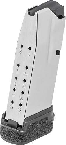 The 13-round magazine for the Hellcat features stainless steel construction for durability, numbered round count witness holes and a black polymer follower. The magazine's black polymer extension gives you extra gripping area and has a pattern that matches the Adaptive Grip Texture of the Hellcat's polymer frame.