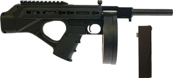 Introducing the NEW Jackhammer Pistol the ultimate in semiautomatic pistols chambered in .22 LR ideally suited for plinking and precision shooting. Designed as an air-cooled blowback operated magazine-fed firearm and meant to be fired as a handgun using a two hand grip. Features a 5 3/8 barrel Picatinny rail mounting provisions and the ability to use 10-round stick or 50-round drum magazines. - Specs: - Caliber: .22 LR - Barrel Length: 5 3/8 - Overall Length: 16 1/2-16 7/8 - Weight: 2 1/2 lbs. - Capacity: 10-Round Stick - Action: Semi Automatic - Material: Aircraft Grade 7075 Machined Aluminum - Controls: Ambidextrous safety