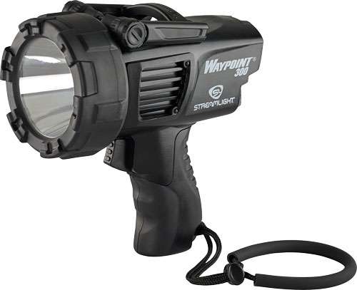 The Waypoint Rechargeable pistol-grip spotlight by Streamlight features C4 LED technology and a rechargeable lithium ion battery that fully recharges in 4 hours. The trigger-style switch provides easy momentary and constant-on operation, and the secondary rotary switch selects high (370 lumens), low (30 lumens), and emergency signal functions. The Waypoint Rechargeable features high-impact polycarbonate housing, a rubberized lens protector, and an integrated stand for scene lighting. It is waterproof to 2 meters and includes a high-strength adjustable lanyard and a 5-ft 120V AC charging cord.
