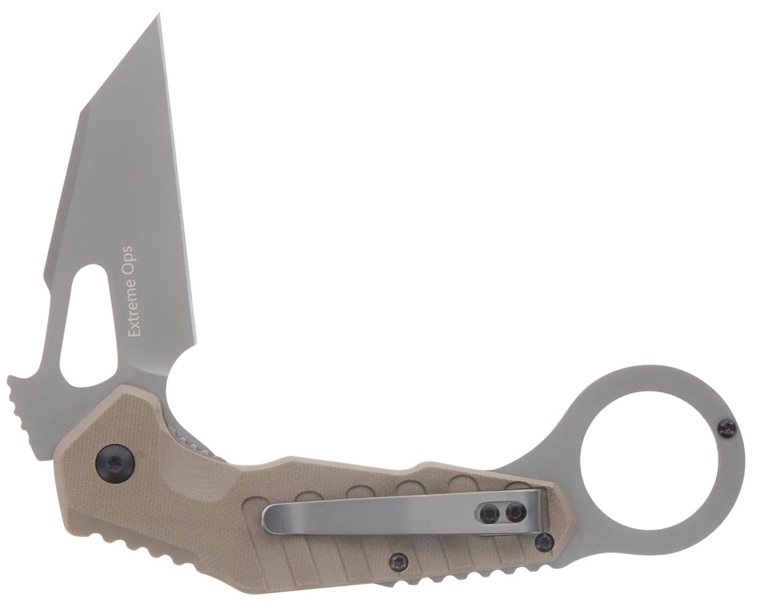 The M&P Extreme Ops Karambit is a new take on a classic knife. The blade is a reverse tanto straight edge which brings a new level of utility to the traditional karambit carry. The back of the knife features prominent jimping with a thumb ramp to help you keep control on more precise cuts. The blade features a pocket hook for quick deployment on draw and the handle has a safety lock which can be engaged to prevent accidental blade deployment. Lastly the hollow oversized finger ring is great for bigger hands and allows for a slightly longer blade length, making the knife a comfortable fit for reverse grip use. The Karambit also features a textured FDE handle makes a great addition to your everday carry gear.