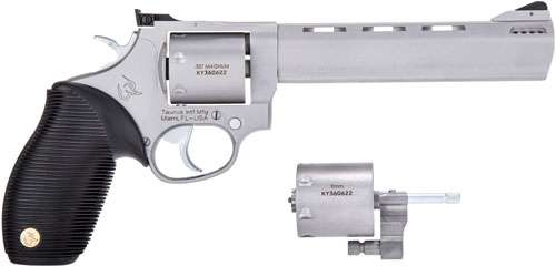 The 7-shot Taurus 692 Multi-Caliber revolver is designed for reliable everyday carry with its 3-inch barrel, and also offers a range-friendly option in the 6-1/2-inch model. Both size variations offer the ability to change the caliber from 38 Special +P/357 Magnum, to 9mm Luger with a simple swap of the cylinder. This DA/SA revolver features a seven round capacity, making it an ideal companion for personal and home defense as well as simply shooting more rounds at the range. The 692 revolver has adjustable rear sights, spurred hammer and Taurus’ Ribber Grip® that aids in accuracy. The ported barrel manages recoil for quicker target re-acquisition. Stellar clips are provided with each revolver.