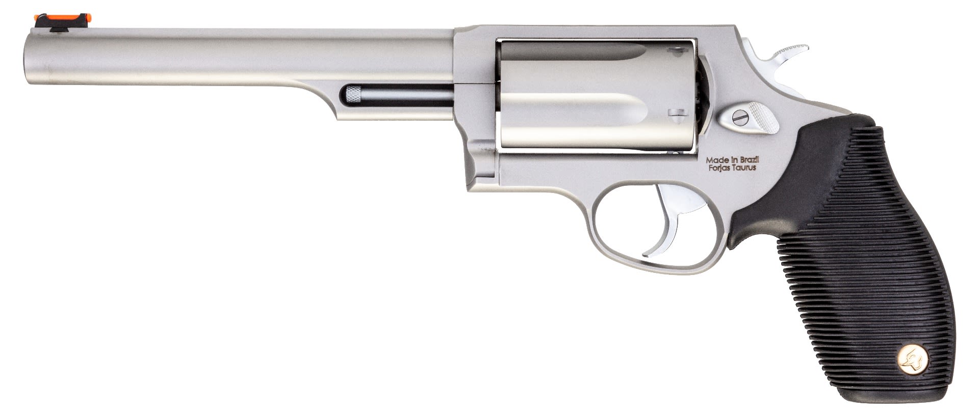 The "Taurus Judge® " is so named because of the number of judges who carry it into the courtroom for their protection. Capable of chambering both .410 2-1/2" shotshell and .45 Colt Ammunition, this amazing combo gun is ideal for short distances - where most altercations occur, or longer distances with the .45 Colt ammo. We have finely tuned the rifling to spread the shot pattern at close quarters or to guide the .45 cal. bullet to the target. Fully customized with fixed rear sights, fiber optic front sights and Taurus Ribber Grips®, the "Taurus Judge" is one decision-maker that lays down the law.
